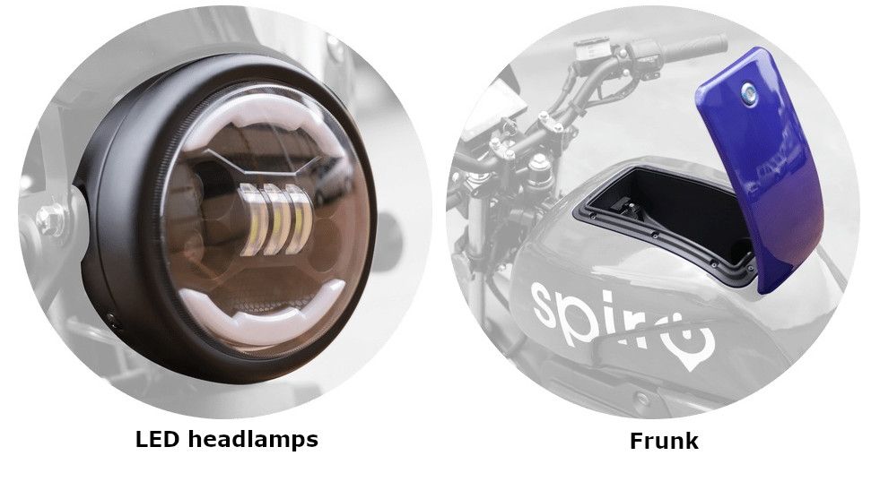 The Spiro Ekon 450M1 delivers 12 hp from its 9 kW motor, balancing efficiency with urban performance. A 5-inch LED display keeps you informed, while the frunk and USB charging port add everyday convenience.