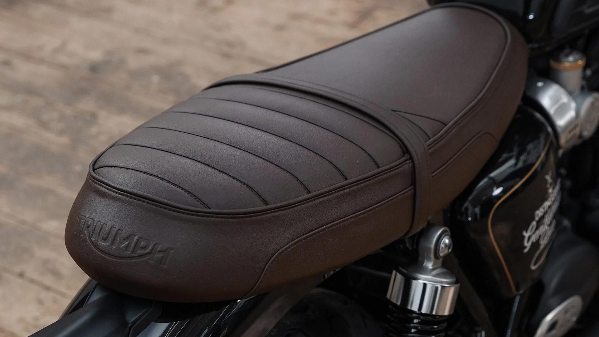 The T120 Black also has an immobilizer transponder built into the key, which adds an extra layer of security. The bike is designed with a two-tone metallic custom paint scheme and official DGR branding, making it stand out from the crowd. The elegant stitched bench seat is a beautiful finishing touch to this classic vintage-style bike.