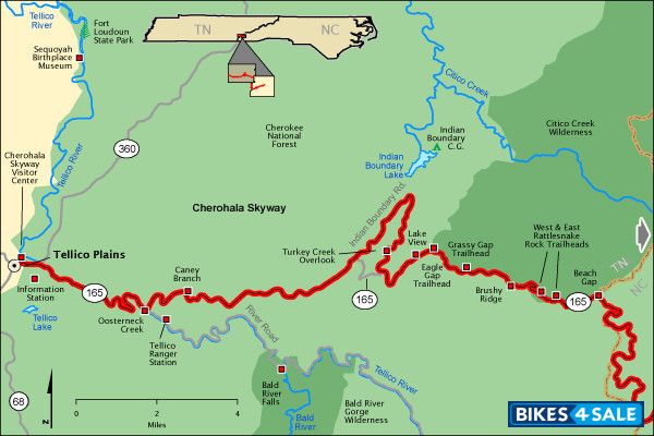 The Cherohala Skyway is a 43-mile National Scenic Byway that winds through the Cherokee National Forest in Tennessee and the Nantahala National Forest in North Carolina. This route offers sweeping curves and panoramic views of the surrounding mountains. The elevation changes along the road provide a diverse riding experience, from lush valleys to high mountain ridges.