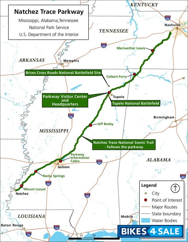 The Natchez Trace Parkway is a scenic 444-mile route that follows a historic path used by Native Americans and early European settlers. This route connects Natchez, Mississippi, to Nashville, Tennessee, offering a peaceful, scenic ride through lush forests, farmland, and historic sites. The parkway is known for its smooth pavement and light traffic, making it ideal for motorcycle touring.